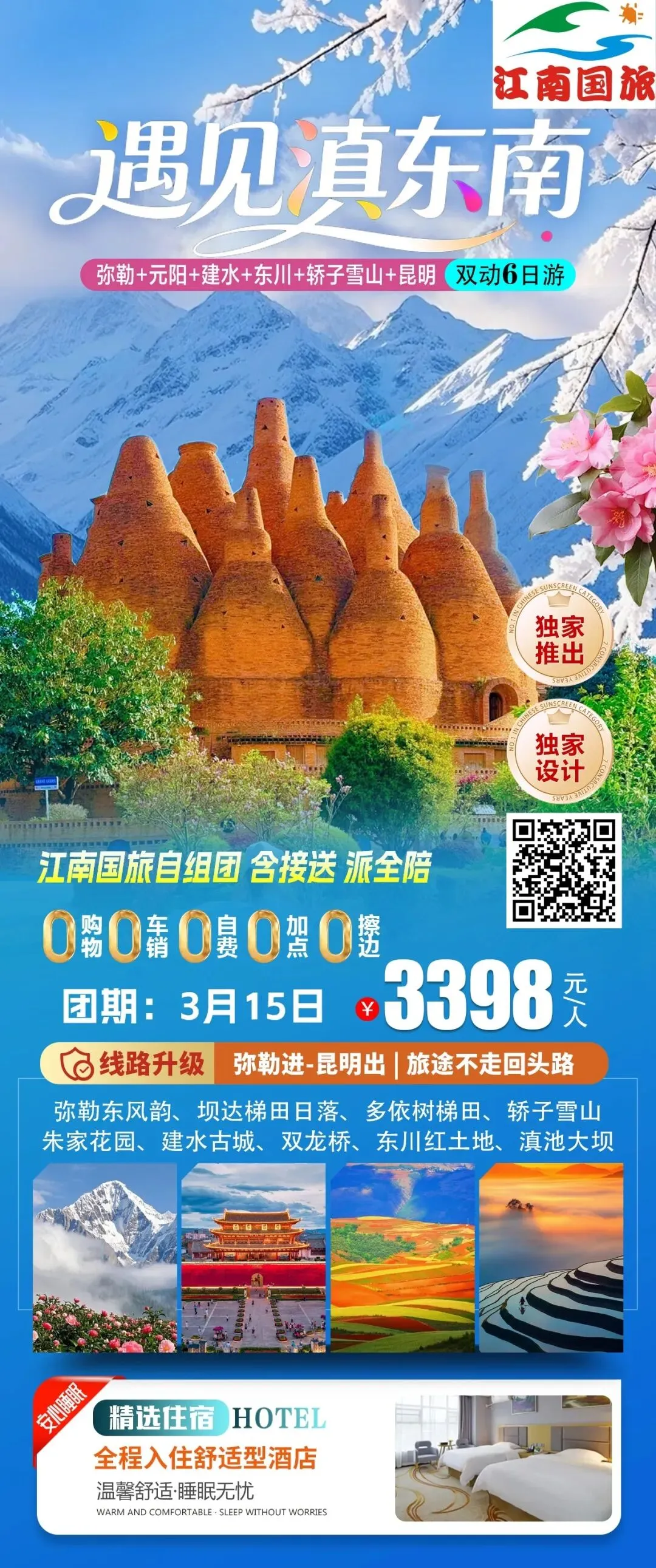 (江南自组)¥3398遇见滇东南,打卡景点:轿子雪山、弥勒东风韵,元阳天梯,建水古城,东川红土地,0购物0车销0自费0加点0擦边双动6天游