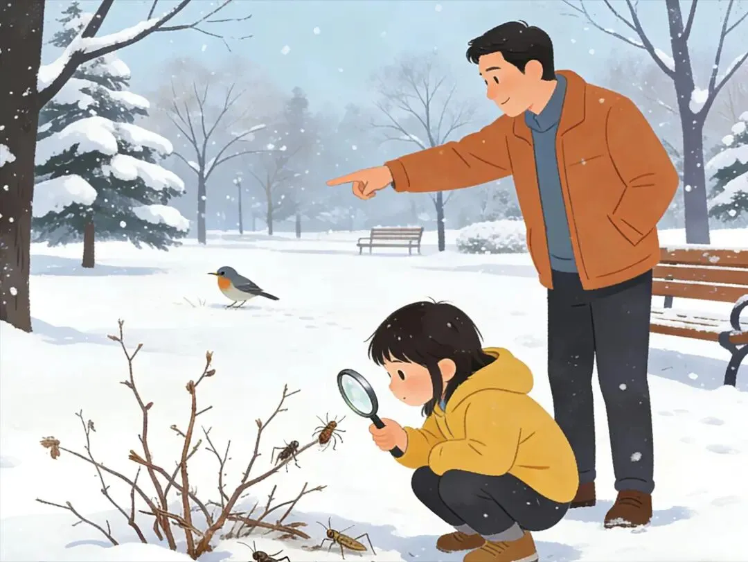 找一棵最老的树,摸摸它的树皮,猜猜它看过多少个春节。 寻找冬天里的生命:扒开落叶找找有没有虫子,看看哪些鸟还在勤奋地觅食。聊聊它们怎么在寒冷中生存。 玩“听见与听不见”的游戏:闭上眼睛一分钟,听听风、远方的车声、自己的呼吸。再睁开眼睛,世界会有点不一样。
