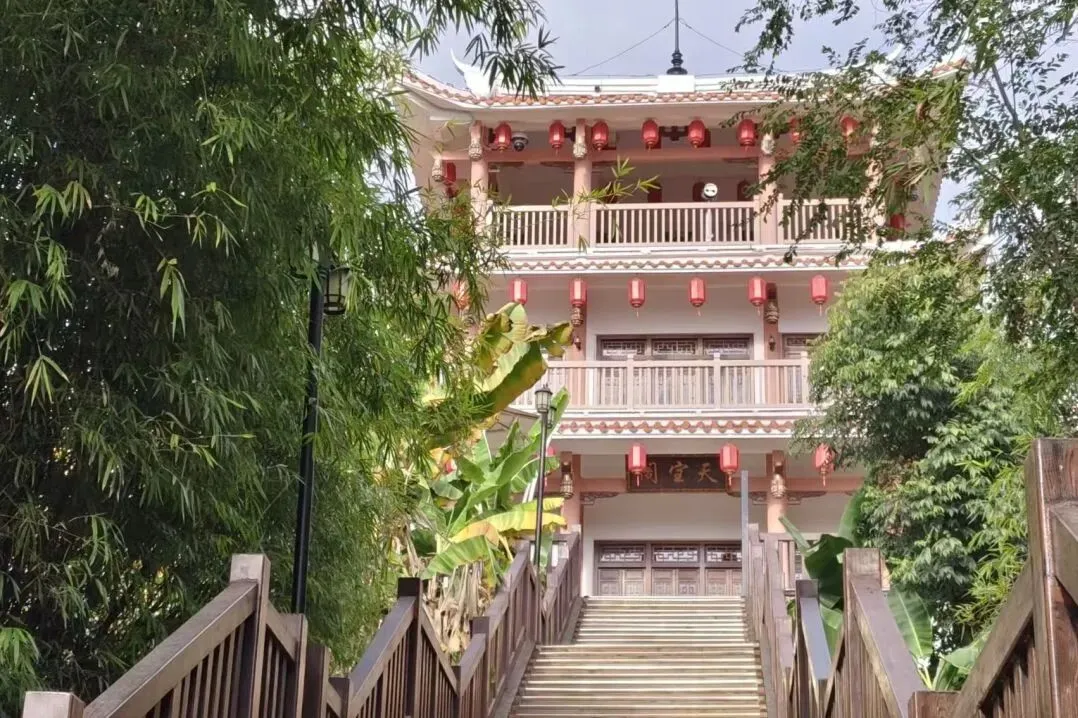拾级而上,抵达园区制高点“天宝阁”,登阁远眺,视野豁然开朗,整片蕉海翻涌着绿意,园区风光尽收眼底,山水亭榭、草木繁花,皆成一幅灵动的山水画卷。