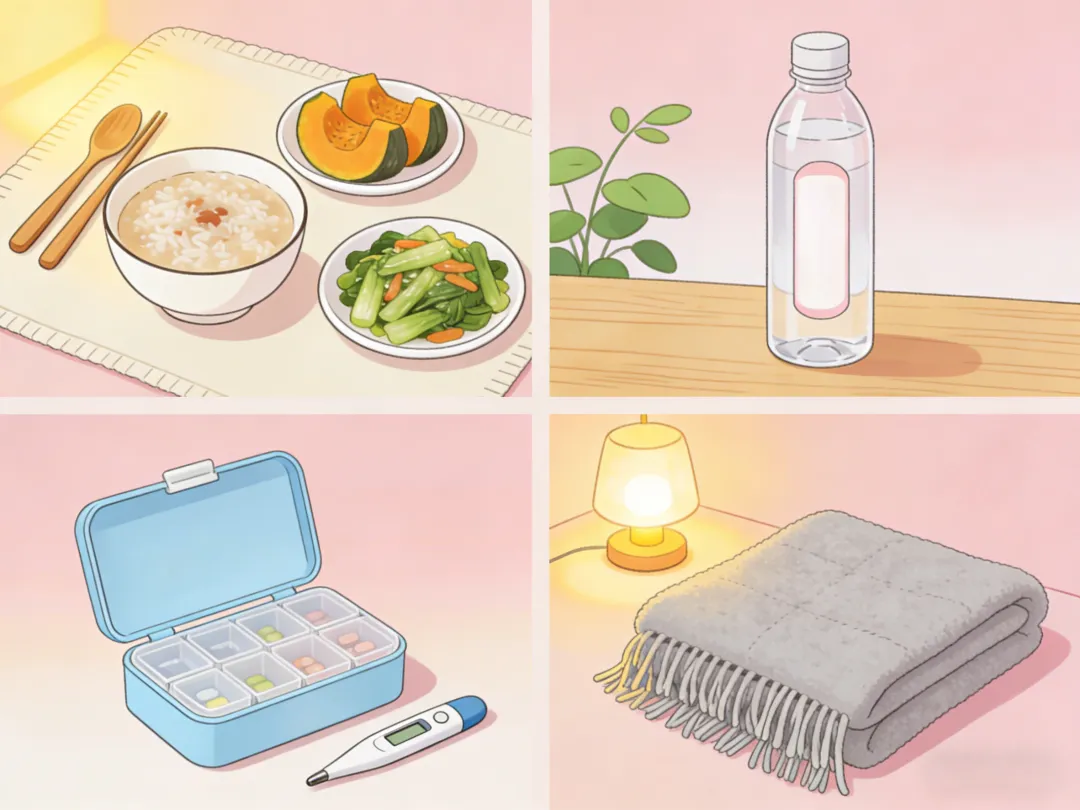 | 饮食调整:暂时告别油腻食物,选择米粥、面条或苏打饼干等清淡易消化的食物。| 及时补水:尤其伴有腹泻时,记得小口、多次地喝温水或口服补液盐,避免身体脱水。