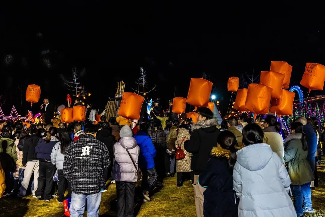 活动尾声,在千灯映照、欢声回荡之际,游客共同放飞承载祈愿的孔明灯,点点灯火摇曳升空,寄寓了对家国安康、万象更新的美好祈愿。