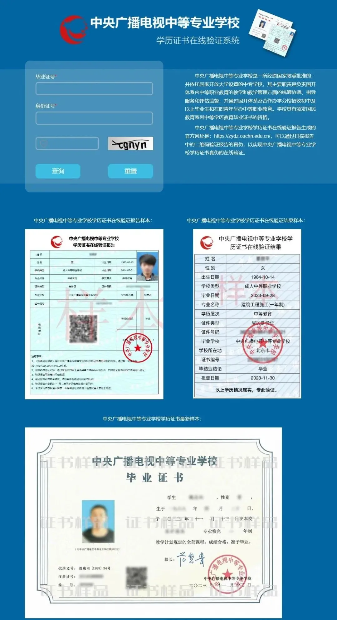 学历证书可在中央广播电视中等专业学校的官网上查询并验证,如有需要可以生成学历证书在线验证报告。