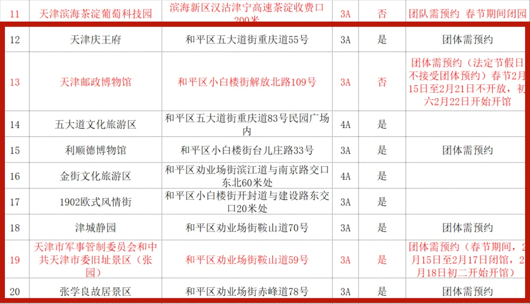 平津战役纪念馆、国家海洋博物馆、周恩来邓颖超纪念馆、“天津之眼”摩天轮等热点景区等共4家景区春节期间正常开放且实施预约;