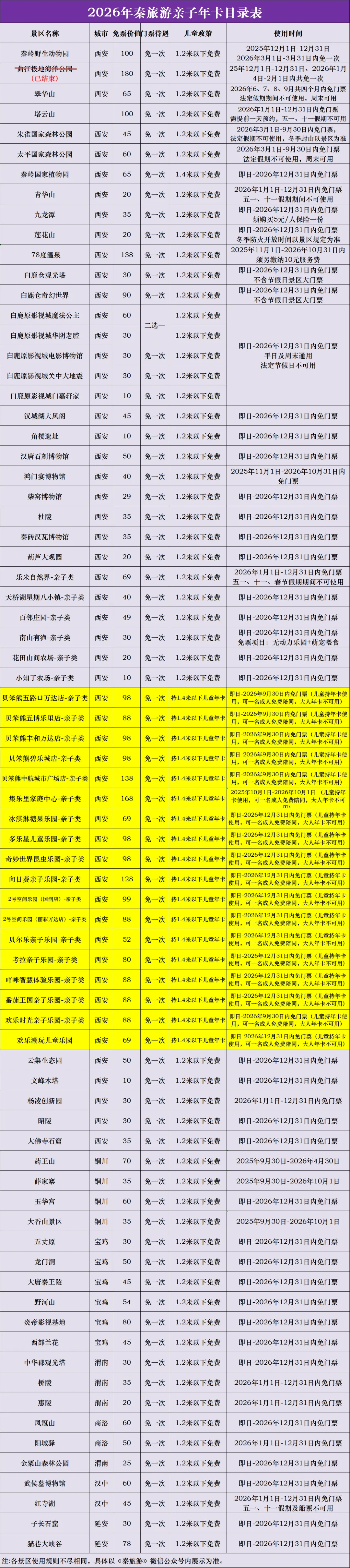 第二种:秦旅游亲子年卡 温馨提示:这个亲子年卡,秦岭野生动物园免门票,比第一种多17个亲子乐园(孩子必须绑定年卡才可使用)。