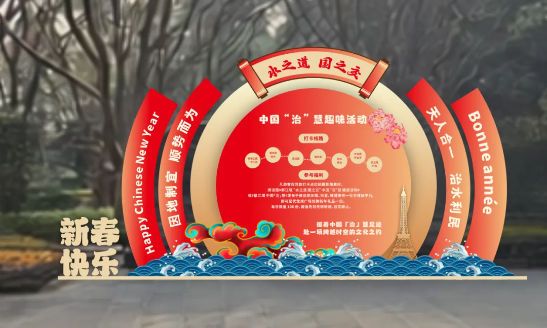游客可循着中国“治”慧足迹,在同款打卡点位拍摄影像素材,携话题#都江堰“水之道 国之交”中国“治”慧 趣游活动#或#都江堰 中国「治」慧#发布微信朋友圈、抖音、微博等任一社交媒体平台,即可至伏龙观广场兑换新年礼品一份。每日限量100份,遵循先到先得原则,领完即止。