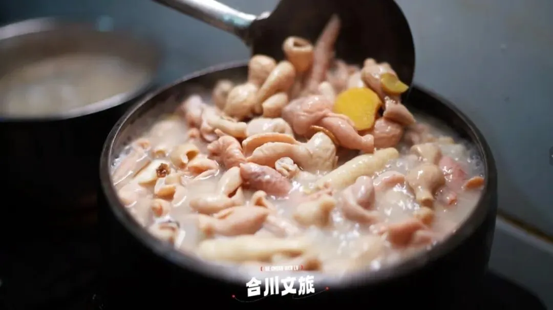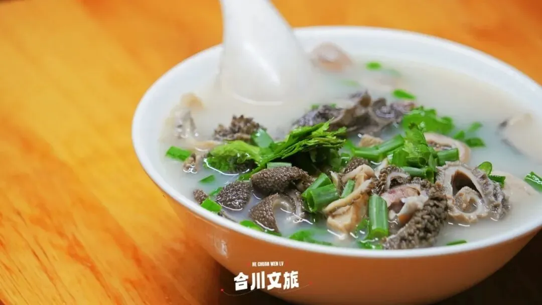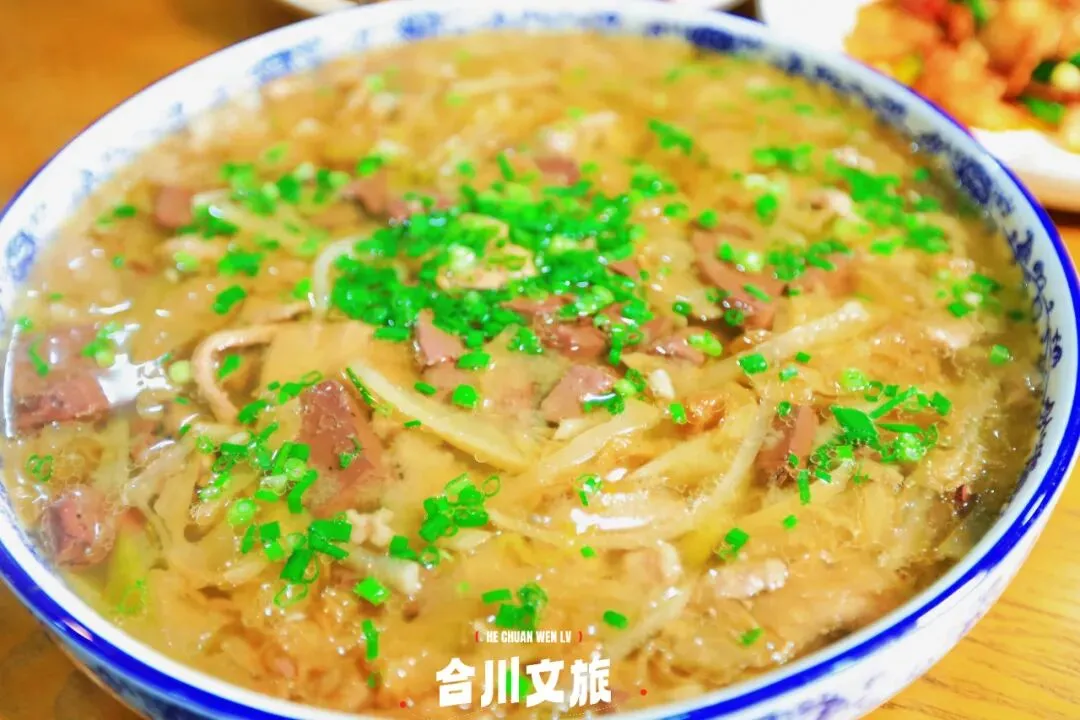 在合川,收官日的早晨必须来点“重量级选手”!肥肠汤与羊杂汤双拼,是本地人的“硬核”选择。肥肠处理得干净,炖得软糯又不失嚼劲;羊杂种类丰富,炖煮到酥烂,汤汁浓郁泛白。喝一口热汤,吃一块肥肠或羊杂,再扒一口米饭,扎实的幸福感从胃里升起,足以支撑一整天的奔波。