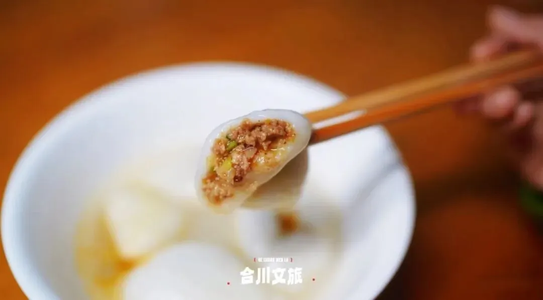 第二天的早晨,当属合川双绝:鸡肉抄手和肉汤圆。抄手皮薄馅足,咬开的瞬间,滚烫的鲜汁在口中四溢,鲜味儿直抵味蕾;肉汤圆更是本地独一份的美味,软糯Q弹的糯米外皮裹着扎实的鲜肉馅,咸香浓郁,口感绵密不腻,一口抄手一口汤圆,两种风味碰撞交融,这般独特的早餐组合,一口便尝尽合川的地道晨味。