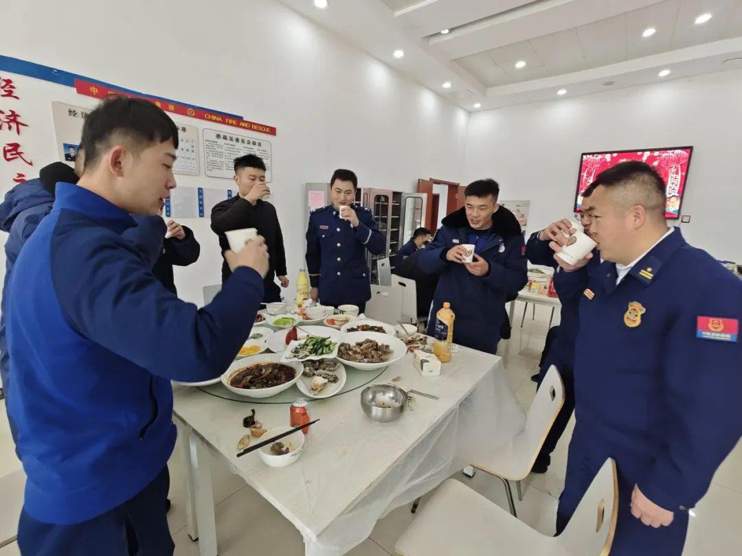 齐聚餐过除夕,倍感节日温暖。大队精心定制了春节食谱,组织全体消防员在一起吃年夜饭,一道道美味可口的菜肴,活跃了大家庭的温暖气息,餐桌上,消防员共聚一堂,喜迎新春,传递祝福。