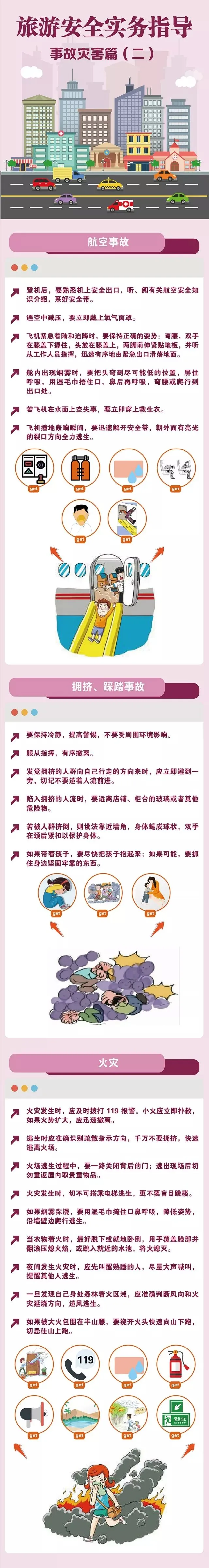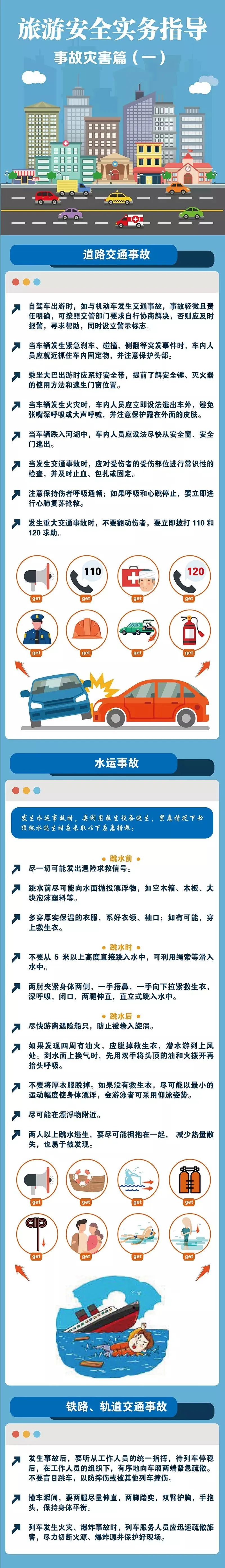 旅途中万一遇到“道路交通事故”“水运事故”“铁路、轨道交通事故”等事故灾害怎么办?阅读《旅游安全务实指导之事故灾害篇》,遇到事故不慌张。