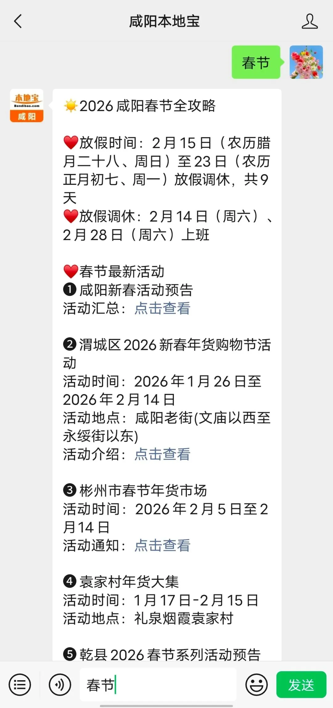 也可以关注【咸阳本地宝】,在后台对话框回复【春节】,持续追踪咸阳春节活动最新汇总、放假安排等,持续更新中