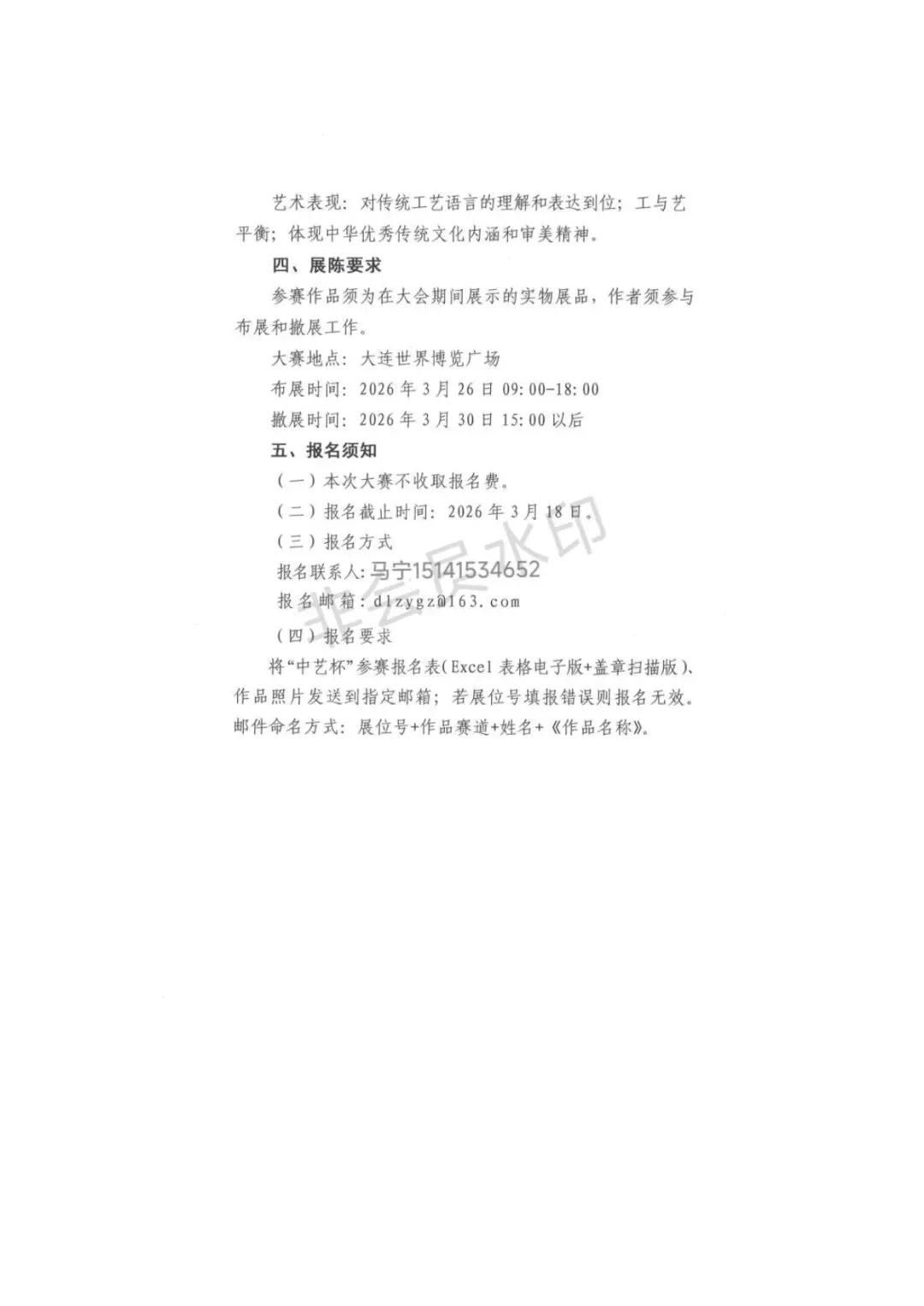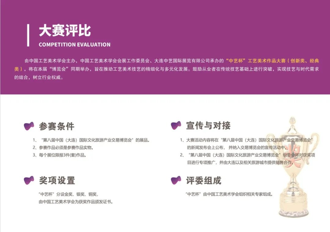 转发关于第八届中国(大连)国际文化旅游产业交易博览会的通知各有关单位、各位会员: 2026年3月27日-3月30日,第八届中国(大连)国际文化旅游产业交易博览会将在大连举办。博览会期间,中国工艺美术学会将主办“中艺杯”工艺美术作品大赛,现将博览会及大赛通知转发你们,欢迎各相关机构、会员和工艺美术工作者踊跃参加。 联系人:杨子健 13879830390 熊 星 13030504878