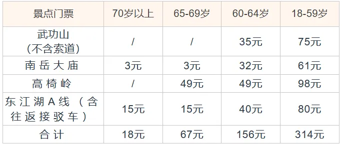备注: 1、武功山索道(必消):往返 170 元/人 2、可选升级南岳衡山(门票(含往返接驳车)自愿自理:18-59岁188元/人,60岁-64岁95元/人,65岁以上40元/人 |