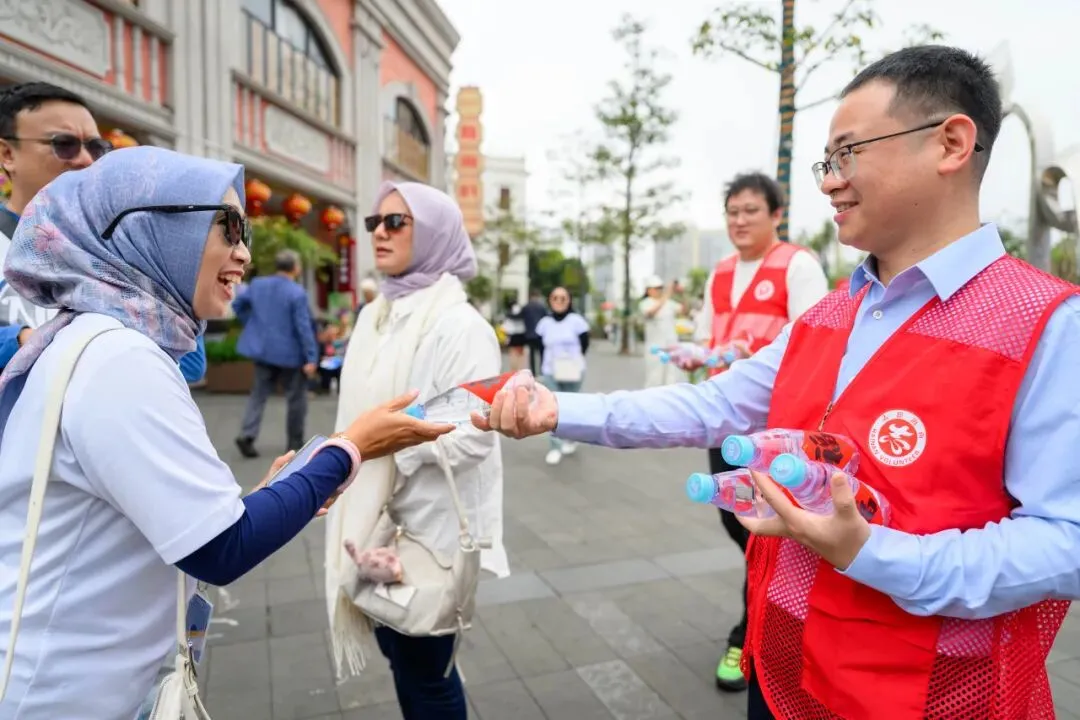 志愿者向游客发放矿泉水