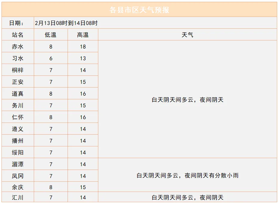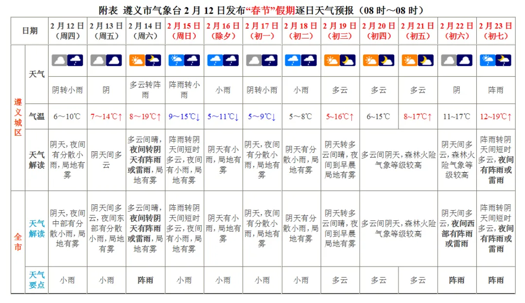 预计“春节”假期期间 (2月15日至23日) 除夕至初二(16日至18日) 全市以阴雨天气为主,多大雾 其余时段白天阴天间多云 夜间偶有阵雨和大雾 遵义城区最高气温将升至19℃左右