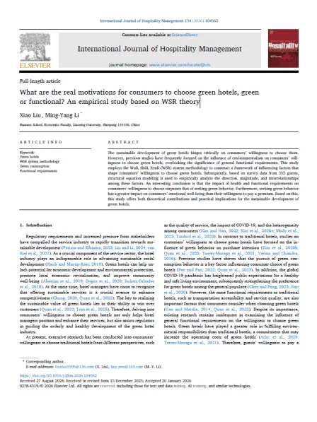 近日,商学院李铭洋教授与其指导的博士研究生刘小合作完成的论文“What are the real motivations for consumers to choose green hotels, green or functional? An empirical study based on WSR theory”发表于旅游管理领域国际权威期刊International Journal of Hospitality Management (IJHM),该期刊为中科院一区Top期刊,ABS三星级期刊,全球酒店管理方向顶级学术期刊,五年影响因子10.3。