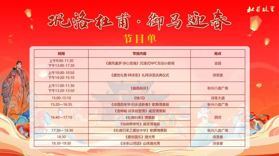 大型威亚情景剧《洛神赋》《先剑奇侠传》唯美呈现,以泗河为幕、山水为景,打造视听双重震撼;《杜甫归来之盛世中华》《诗酒觅年华·归乡话新春》等实景剧倾情演绎,再现诗圣家国情怀,让游客在观演中读懂杜诗文脉;全园NPC巡游互动不停,诗圣扮相、古风佳人随处可见,对上诗句、参与问答即可赢取新春好礼,沉浸式感受盛唐新春气息。