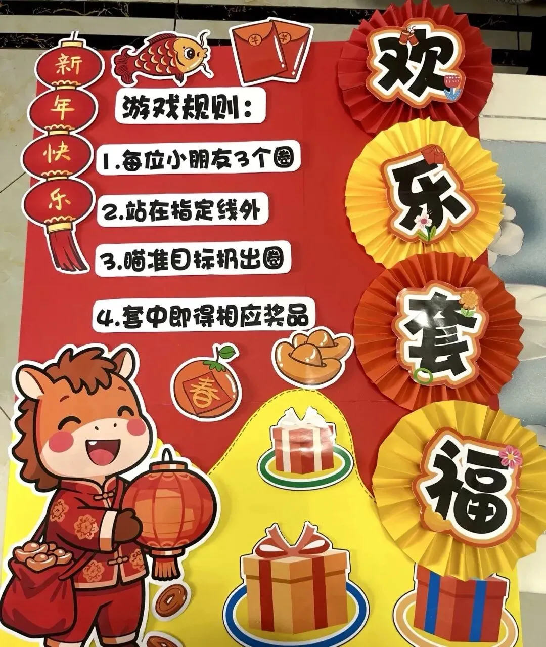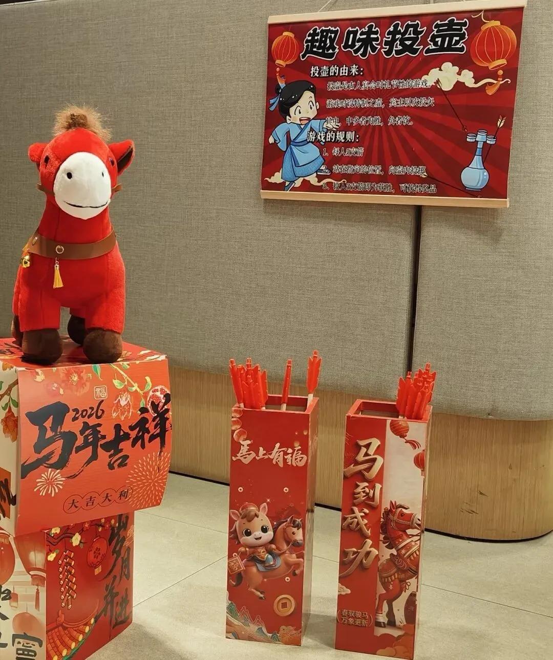 1.“马到成功” 投壶:传统投壶游戏,箭矢设计为骏马造型,投中不同区域对应不同新春礼品(福袋、小挂件、动感体验馆优惠券)。