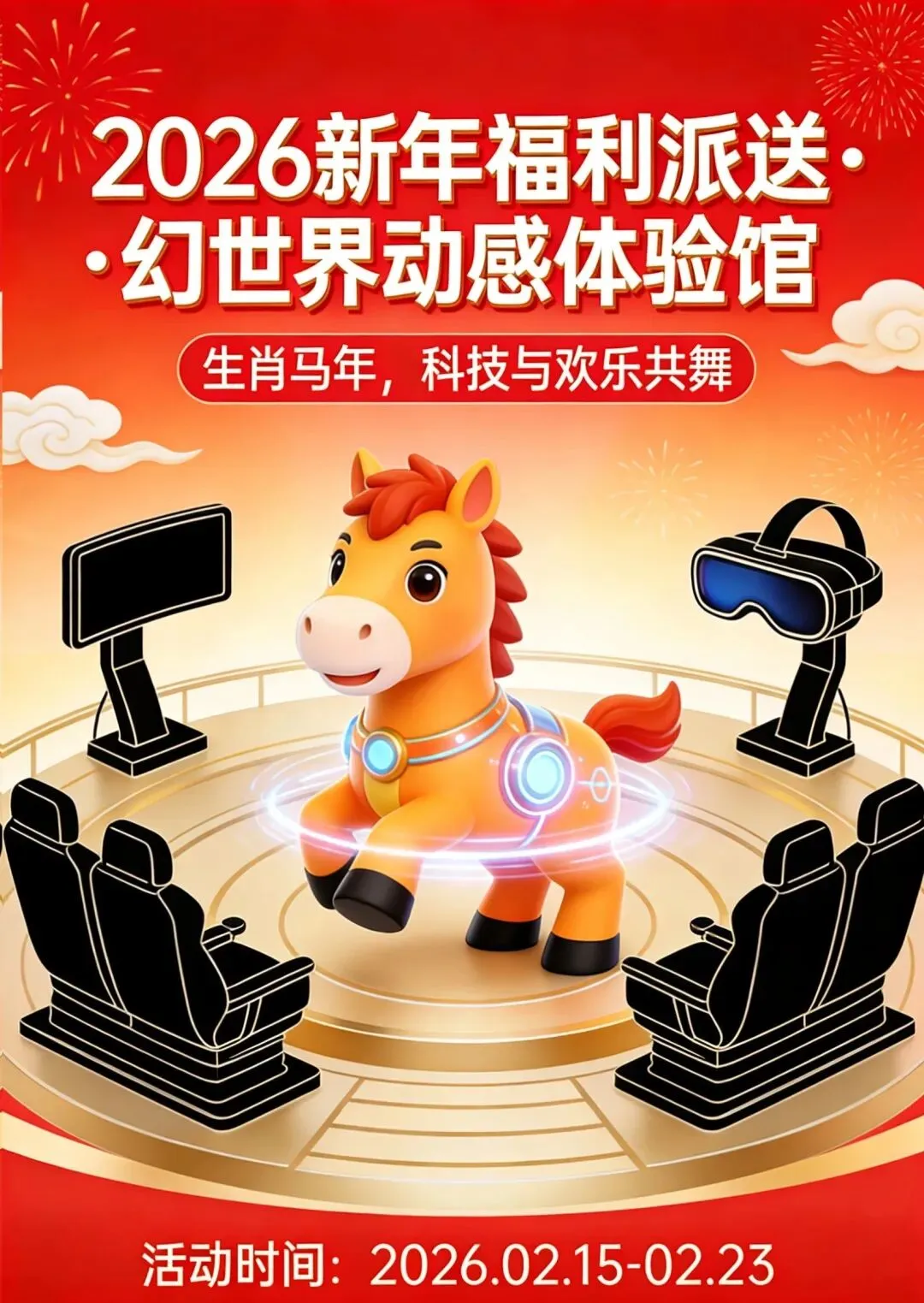 2.幸运抽奖:每日 16:00(延长时段 20:00)开展现场抽奖,凭VR小票即可参与,奖品包括幻世界动感体验馆免费体验券、新春大礼包、马年主题文创产品。