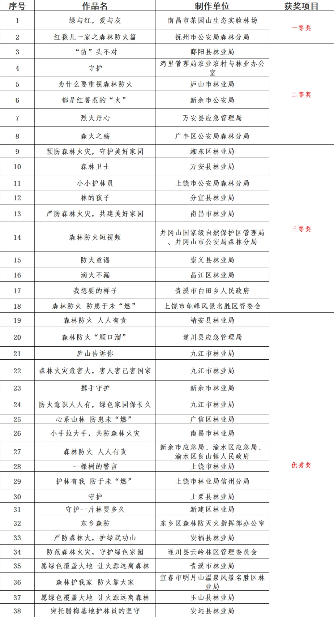 本次大赛共收到11个设区市和江西庐山国家级自然保护区管理局推选的作品103件。根据活动方案,经参赛资格审核、专家评审、公示等程序,共评选出获奖作品38件,最佳组织奖12个;其中,《绿与红,爱与灰》《红孩儿一家之森林防火篇》等2件作品获得一等奖;《“苗”头不对》等6件作品获得二等奖;《预防森林火灾,守护绿色家园》等10件作品获得三等奖;《森林防火 人人有责》等20件作品获得优秀奖;南昌市林业局等12个单位获最佳组织奖。获奖名单详见附件。