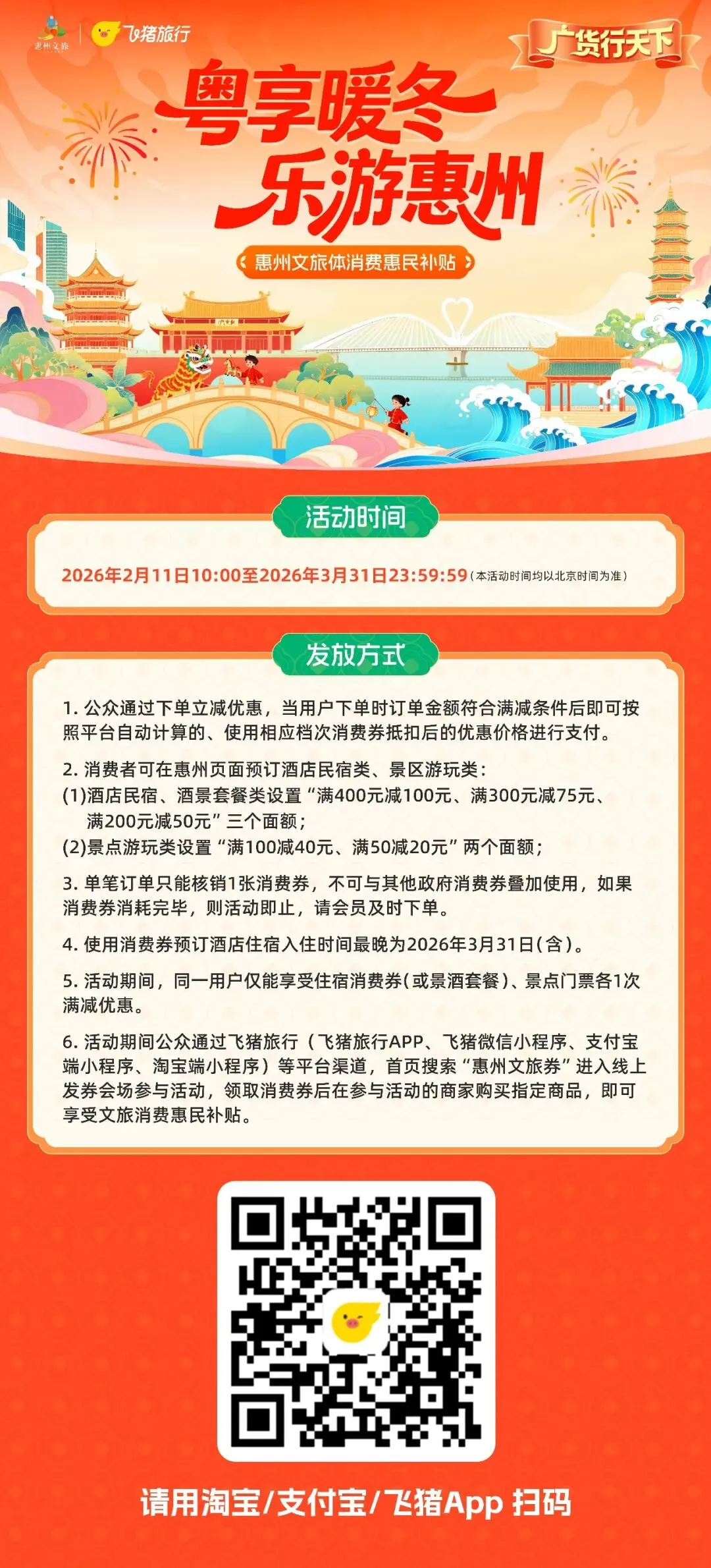 为让大家度过一个温暖、欢乐又实惠的新春假期,惠州市文化广电旅游体育局携手飞猪旅行,正式启动「粤享暖冬·乐游惠州」消费券活动,邀您共赴这场地道岭南年味之旅!