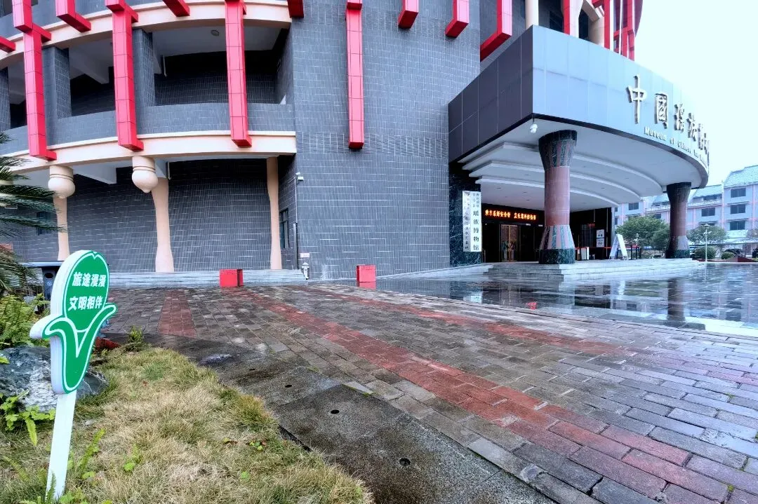 瑶族博物馆门前宣传标语“旅途漫漫 文明相伴”。文明旅游,保护生态;不践踏花草,不随地扔垃圾。