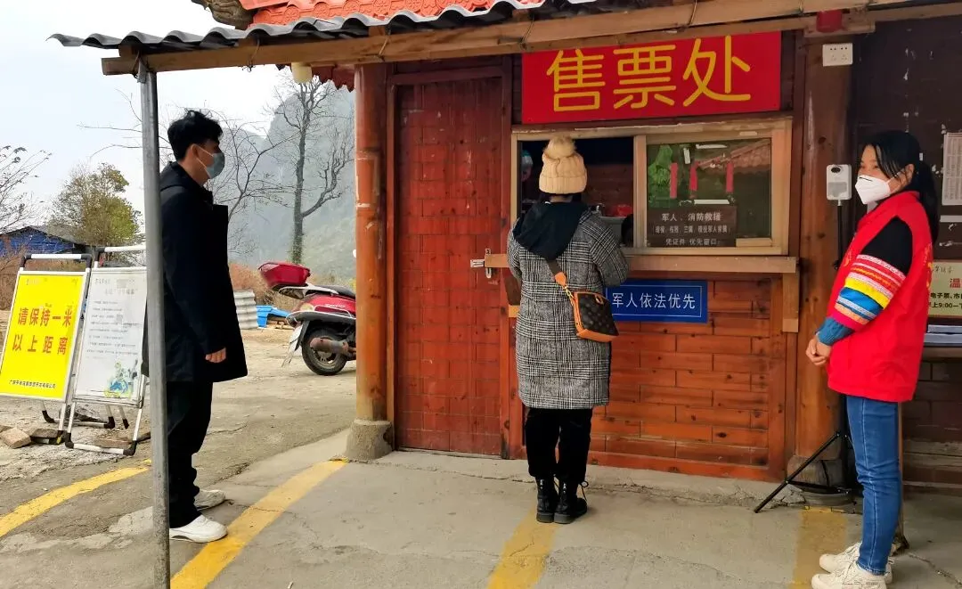 文明旅游,间隔一米,有序排队,千年瑶寨景区的志愿者时刻保持售票秩序。