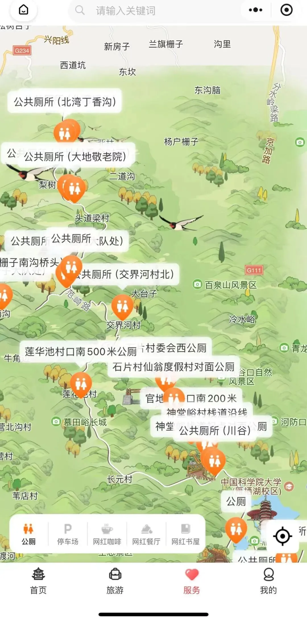 第三个是服务模块。服务模块依托雁栖镇数字地图,贴心标注公共服务设施地点,提供精准导航,帮助您轻松找到车位及公共卫生间,为旅行增添更多便利与安心。