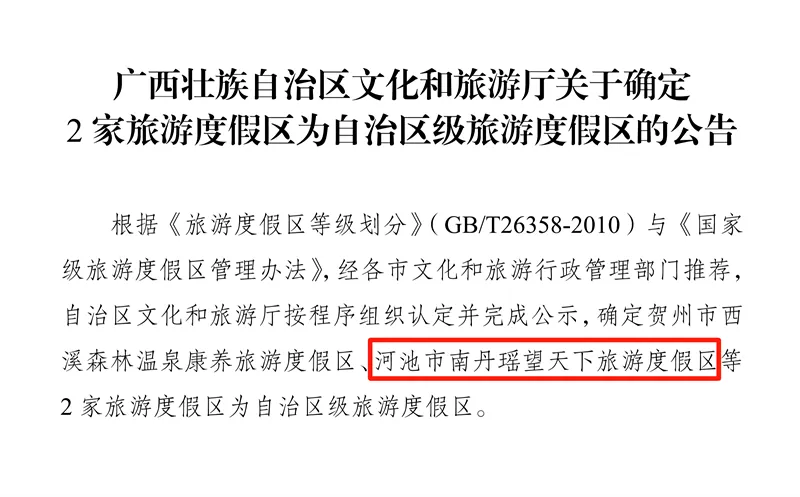 近日,广西壮族自治区文化和旅游厅公示了自治区度假区名单,河池市南丹瑶望天下旅游度假区正式确定为自治区级旅游度假区。标志着我市在旅游度假区建设上再次迈出坚实步伐,成为我市继宜州下枧河旅游度假区与巴马盘阳河旅游度假区之后,成功创建的第三家自治区级旅游度假区。
