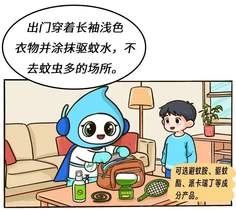 穿衣防护:出门最好穿着长袖浅色衣物并涂抹驱蚊水,避免去蚊虫较多的场所。