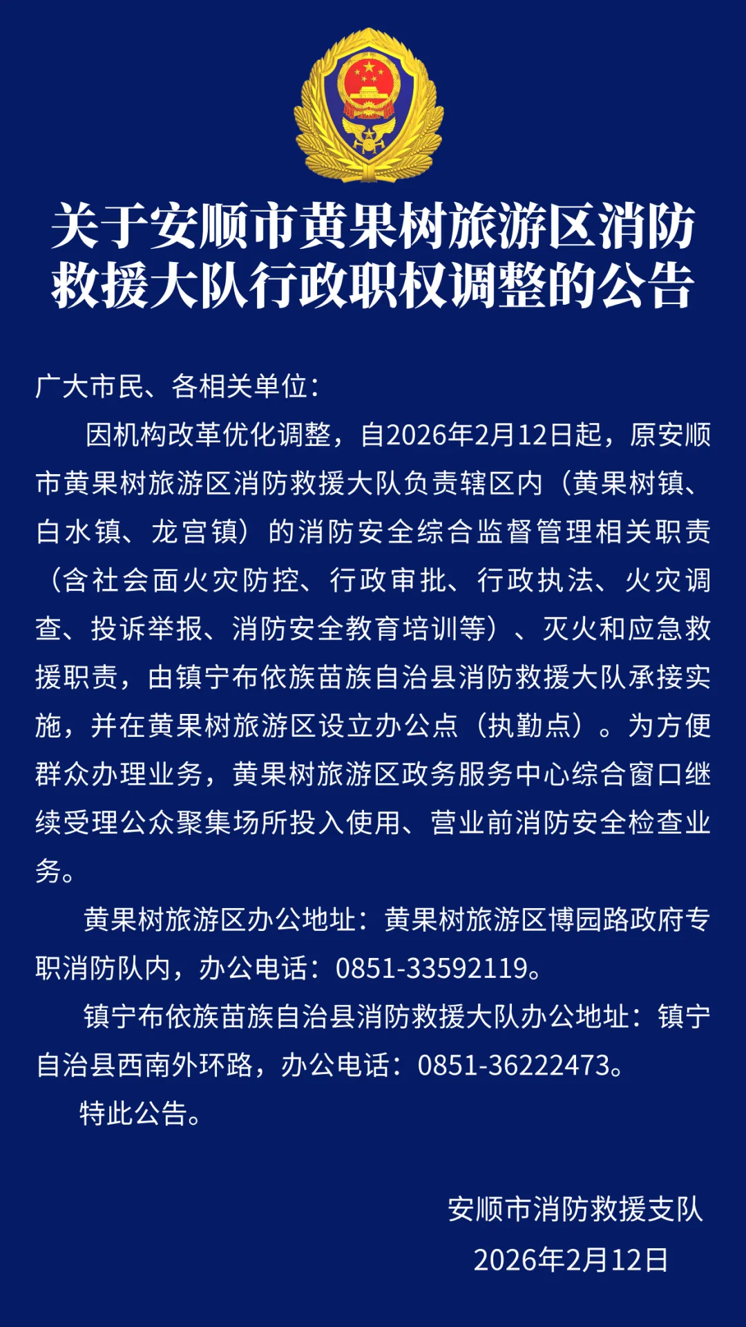 关于安顺市黄果树旅游区消防救援大队行政职权调整的公告