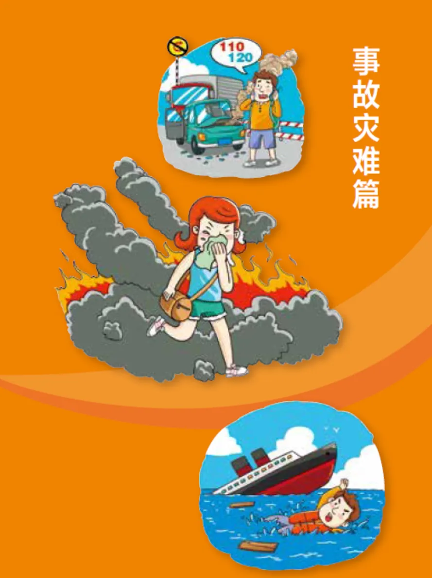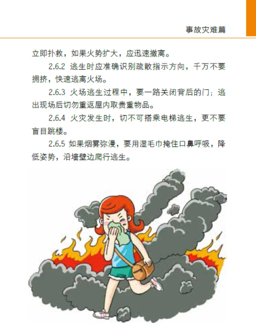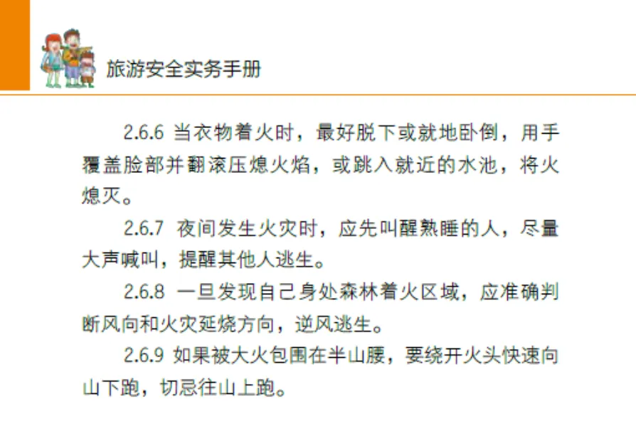 火灾: 小火快灭,大火快逃!湿巾捂口鼻,低姿沿墙走。别乘电梯!身上着火,就地打滚。森林火灾?逆风逃生。