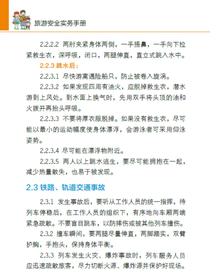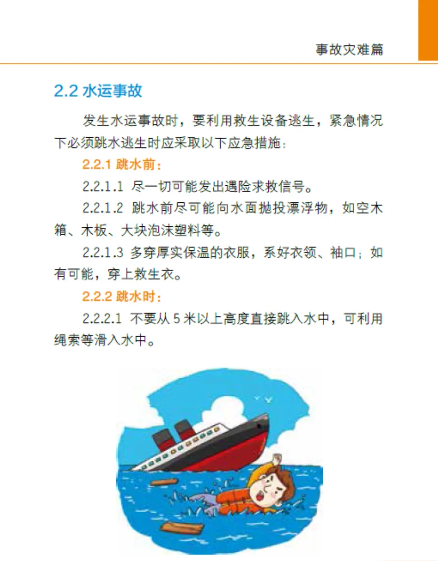 水运事故: 跳水前抛漂浮物,穿救生衣。跳水姿势要直立。落水后游离船只,防油火。