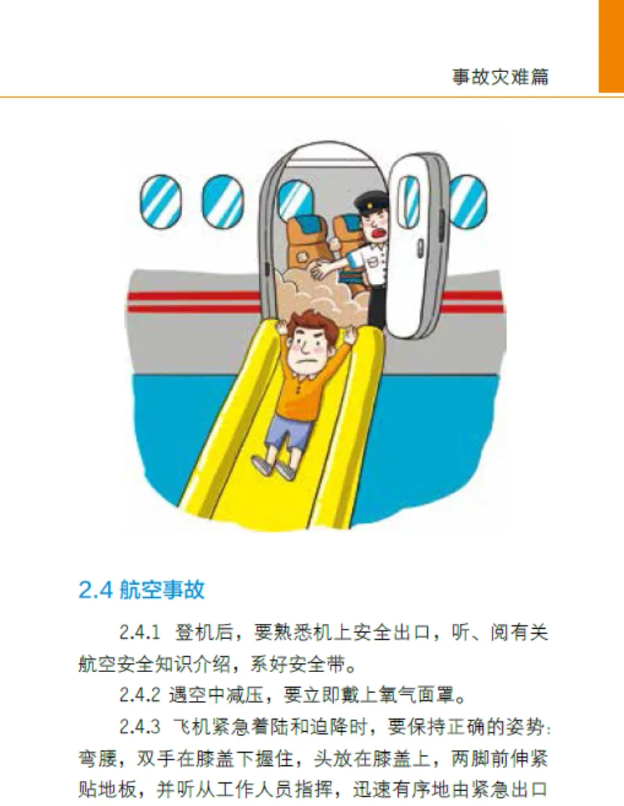 航空事故: 熟悉安全出口,系好安全带!减压戴氧气面罩。迫降时弯腰抱头,按指令滑出。有烟雾?湿巾捂口鼻,低姿爬行。