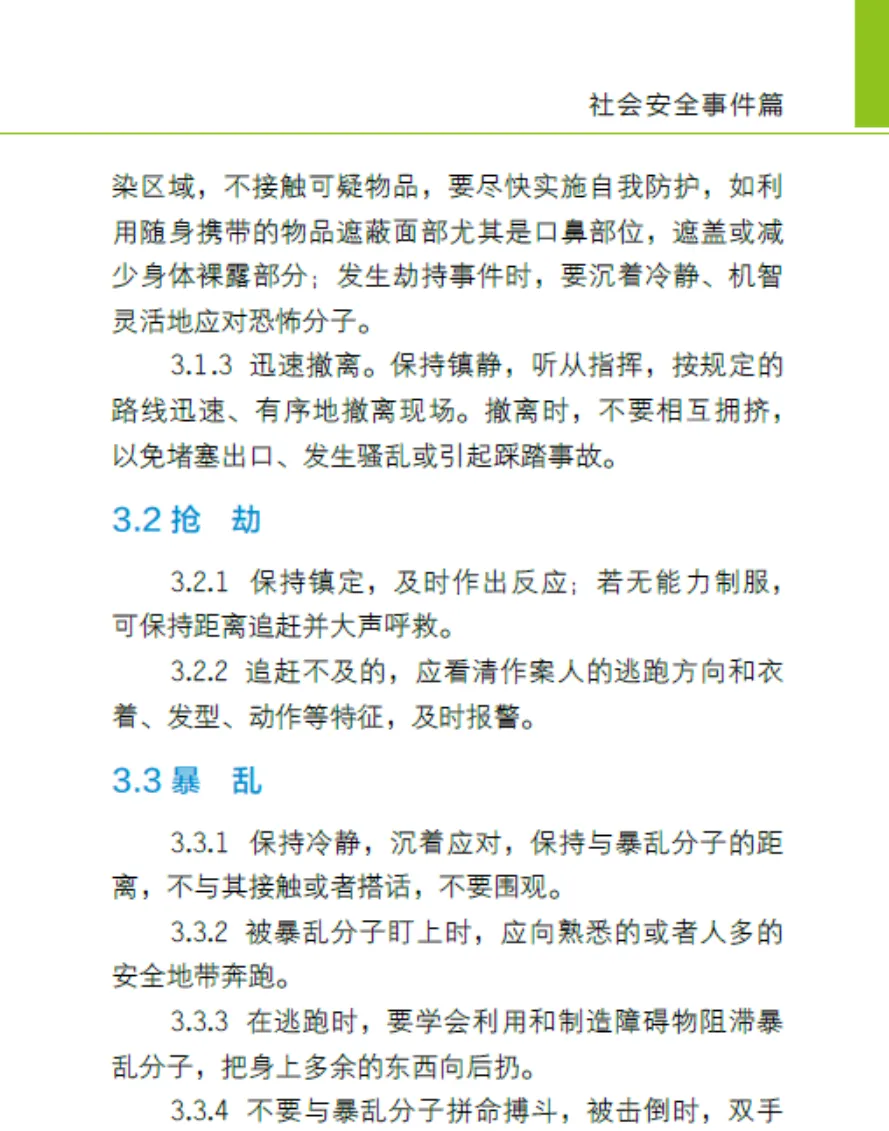 遇暴乱:不围观,迅速远离,向人多安全区跑,制造障碍阻滞,保护要害。