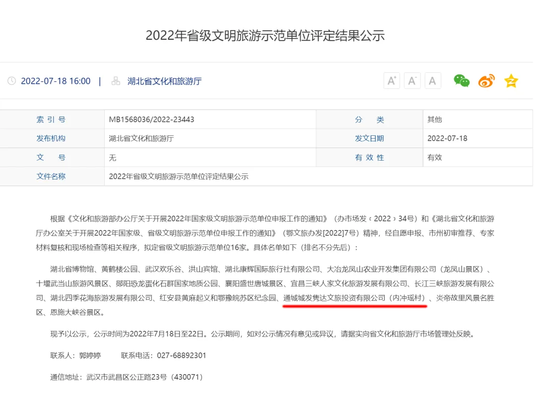 喜报!内冲瑶族村荣获省级文明旅游示范单位!近日,湖北省文化和旅游厅发布了《2022年省级文明旅游示范单位评定结果公示》,拟定省级文明旅游示范单位16家,通城城发隽达(内冲瑶村)榜上有名!
