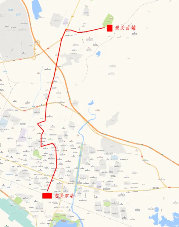 包头东站—南门外大街—和平路—西门大街—内环路—石桥街—北大街—包白公路—开元路—集贤路—包头古城