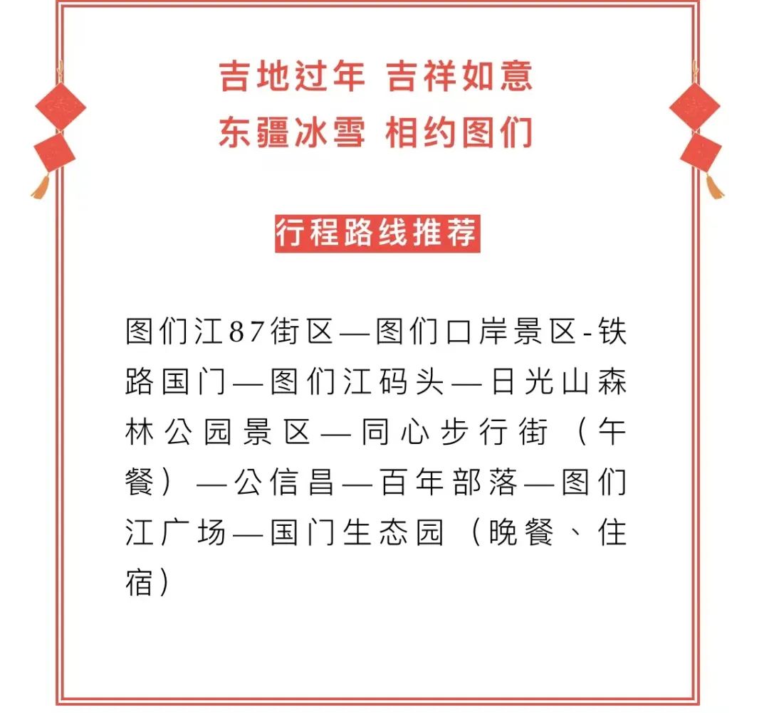 为让春节假期“活”起来,图们市围绕“非遗、民俗、歌舞、互动”四个方面,组织开展“图强奋进·鼓舞飞扬”迎新年文艺晚会、第二届“图们江畔风情浓·百年老宅炙暖炕”传统火炕节、图们市“图强奋发·鱼跃图们”冬钓旅游节等10场节庆活动,让各民族市民游客充分感受中华民族传统风俗,共同欢喜过“图”年。