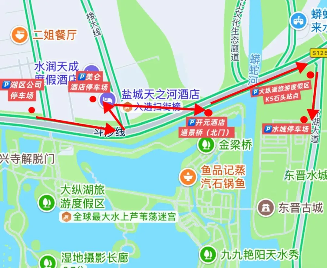 线路一:湖区公司停车场→美仑酒店停车场→开元酒店通景桥(北门)→大纵湖旅游度假区K5