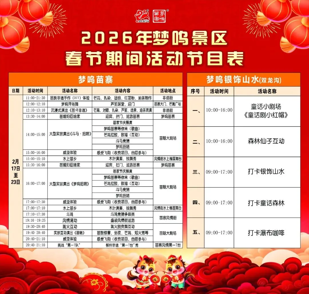 2026年春节,融水梦呜银饰山水全新亮相,苗寨民俗大戏同步开演,带你沉浸体验浓郁苗族年味。