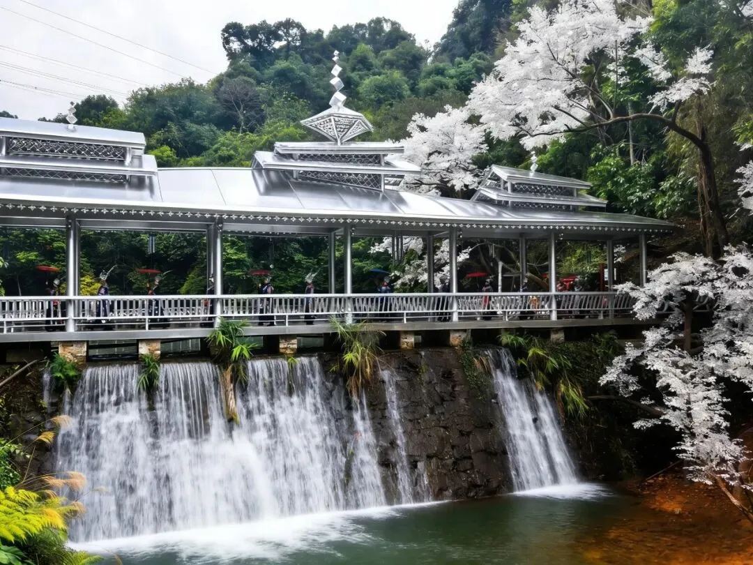 景区将苗族银饰元素深度融入山水肌理,银饰纹样点缀林间步道,银饰造型与瀑布、绿植相映成趣,每一步都能感受苗族银饰文化与自然山水的完美碰撞,和山下的梦呜苗寨形成山水呼应的苗韵景观带,走在其中,仿佛闯入了银饰打造的童话世界。