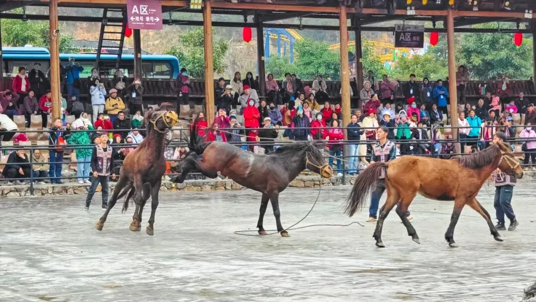 每天14:00和16:00,苗寨大剧场内马蹄声声,骁勇的斗马展开激烈角逐,获胜的骏马主人还将参与“招婿”互动,芦笙伴奏、芒篙助阵,原汁原味的苗寨古俗,带你体验最热血的苗族风情。