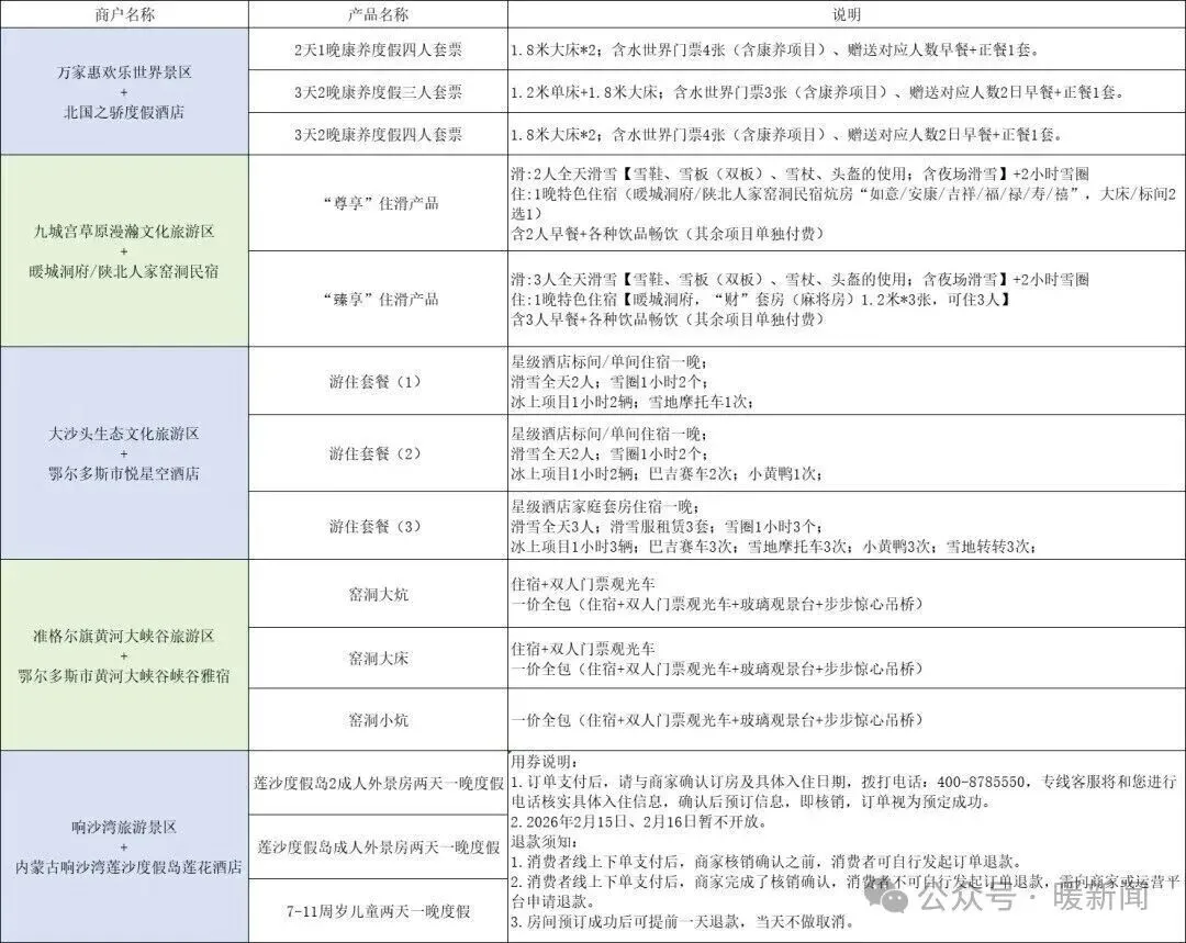 3.核销方式: (1)景区住宿通用券:消费者抢到券后,可以在参与活动商家就住宿或景区产品消费时,按照满额立减方式进行核销使用。 (2)景区住宿组合券:消费者抢到券后,可以通过“云游商城”选购组合产品包或者到参与活动的景区就住宿和游玩产品根据消费需求进行组合,按照满额立减方式进行核销使用。 关键规则 1.有效期: (1)所有消费券有效期为获券之日起4小时内,逾期消费券将退回重新发放,消费者可重新领取。 (2)景区定制产品组合包经购买后有效期为5日,逾期未消费,将自动退款,消费者可重新领取。 2.领用限制: (1)通用消费券:每名消费者(每个ID号)最多可领取使用4张不同额度的消费券,不可拆单使用。 (2)组合消费券:每名消费者(每个ID号)最多可领取3张不同额度的消费券,活动开展期间只能使用2张,不可以拆单使用。 参与资格:无门槛!全民可抢! 所有市民+外地游客 不限户籍、不限年龄 轻松开启鄂尔多斯暖冬微度假 参与商户名单 万家惠欢乐世界 北国之骄度假酒店 九城宫草原漫瀚文化旅游区 暖城洞府 陕北人家窑洞民宿 大沙头生态文化旅游区 鄂尔多斯市悦星空酒店 准格尔旗黄河大峡谷旅游区 鄂尔多斯市黄河大峡谷峡谷雅宿 响沙湾旅游景区 内蒙古响沙湾莲沙度假岛莲花酒店 内蒙古库布其沙漠旅游景区(线下购买核销) 万舟滑雪场(线下购买核销) 内蒙古趣野民宿服务有限公司(线下购买核销) 兴昌渔村(线下购买核销) 线上产品列表
