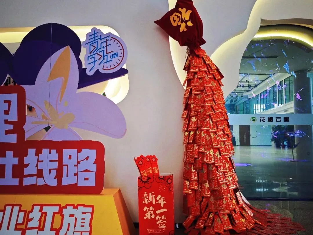 展厅入口处特别打造“福气瀑布”艺术装置,并设置“新年第一签”互动环节,游客可于此抽取寓意吉祥的专属新年签文,快来开启福运满满的新春之旅吧。