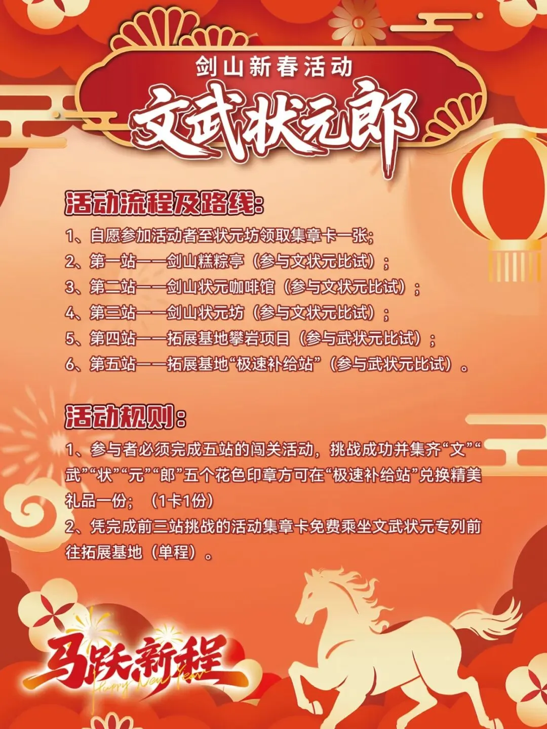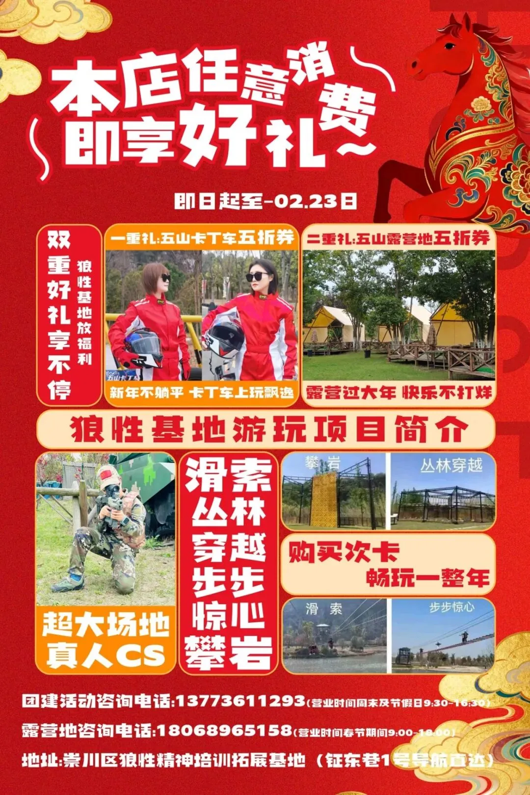 (1)凡在状元咖啡、荷里咖啡、荷花餐厅任意消费者,即可获赠卡丁车项目对折体验券1张,凭此券,圆你武状元飞驰梦;乘此风,助你新岁里马到功成,时间即日起至2月23日;