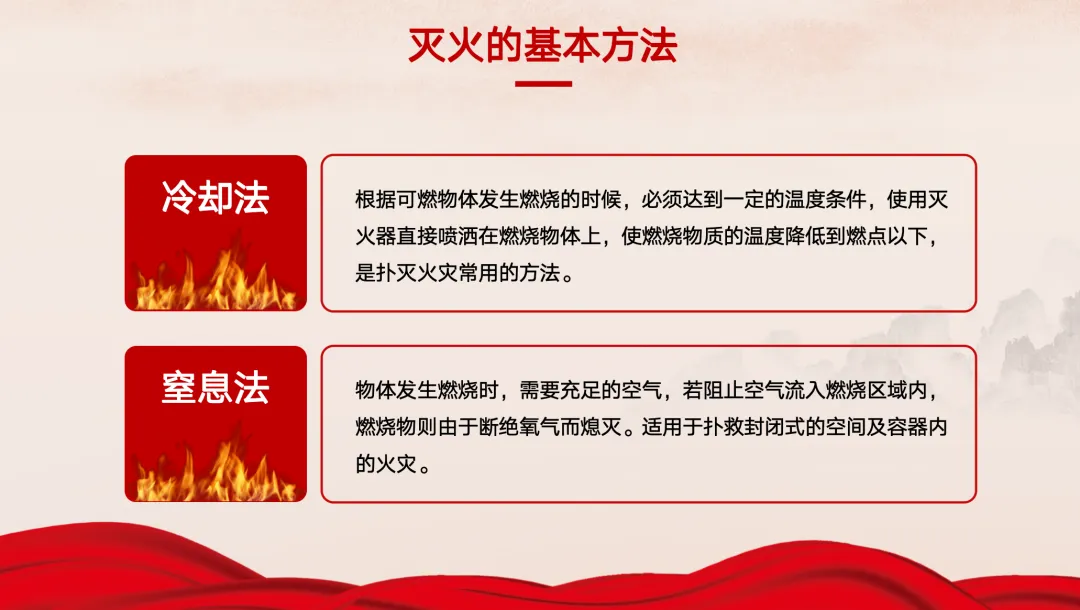 冷却灭火法(降低燃烧物温度至燃点以下)