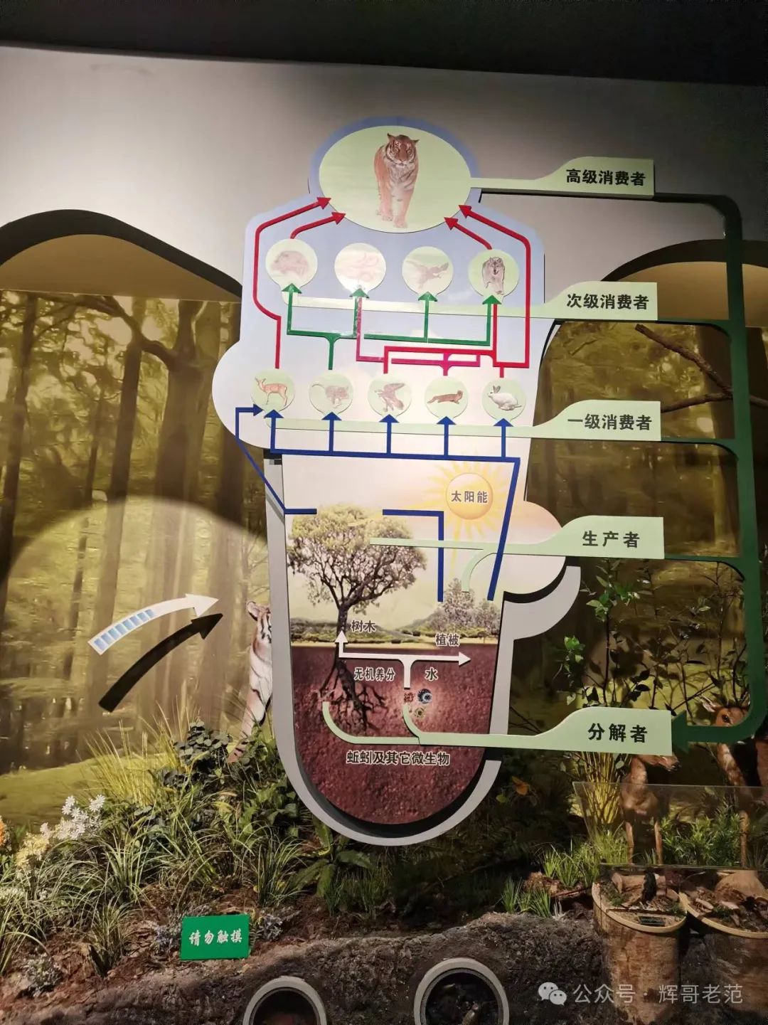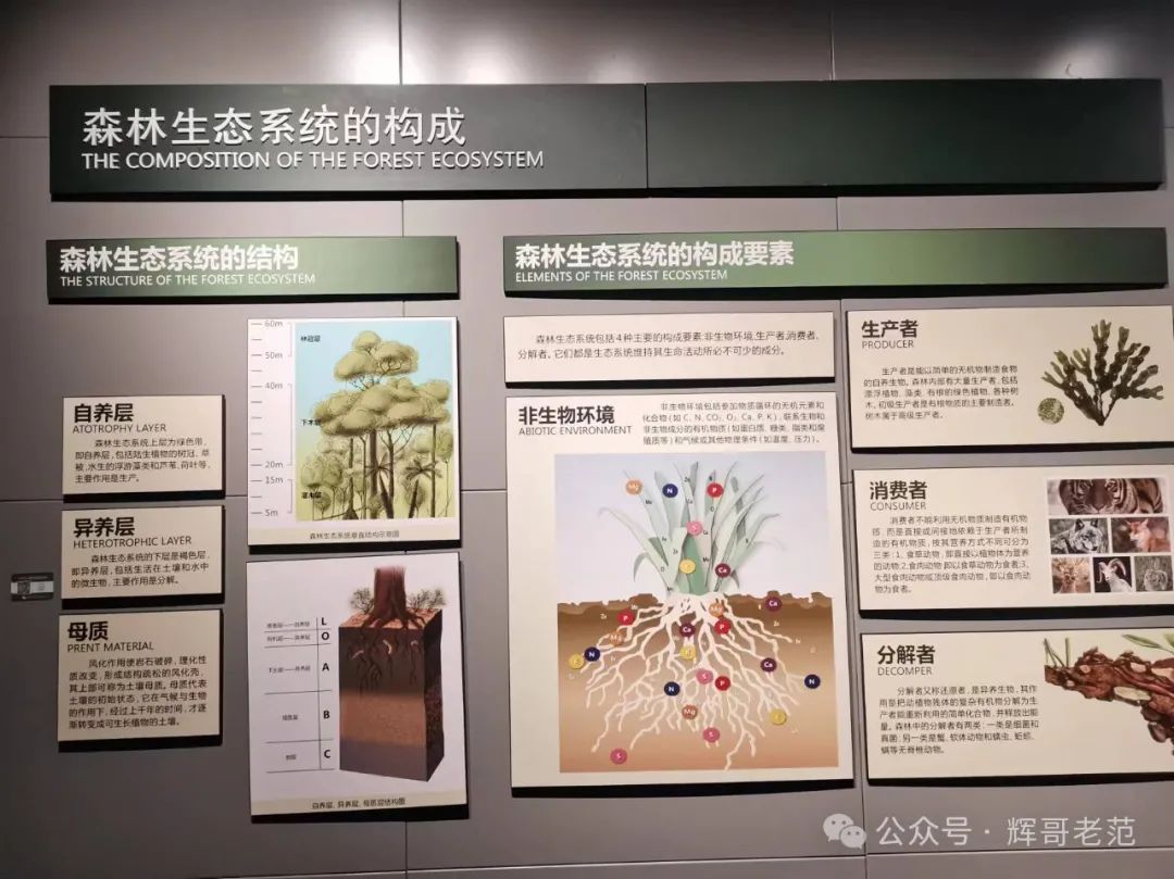在东北林业大学里的中国森林博物馆,最触动我的是 “森林生态系统的构成”。森林生态系统,包括生产者、消费者、分解者和非生物环境四大要素。“生产者”比如树木,可为人类提供果蔬,供给木材;“消费者”比如人类和动物,向森林索要吃喝;“分解者”,就是把动植物腐朽、死亡的残体分解,变为“生产者”能重新利用的简单化合物,这比如细菌、真菌,比如蠕虫、蚯蚓等等。它们三者共同组成了一个系统,缺一不可。而“非生物环境”比如土壤,比如气候等环境条件,它是生产者、消费者、分解者赖以生存的基础。
