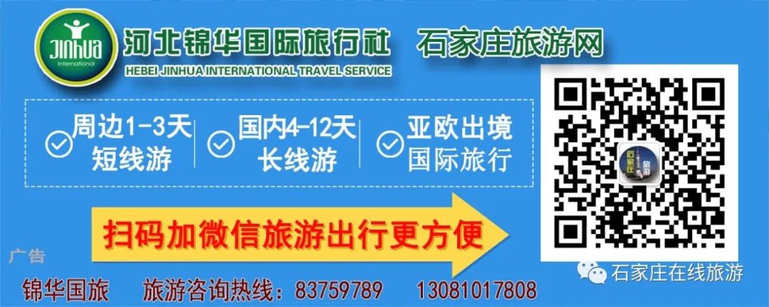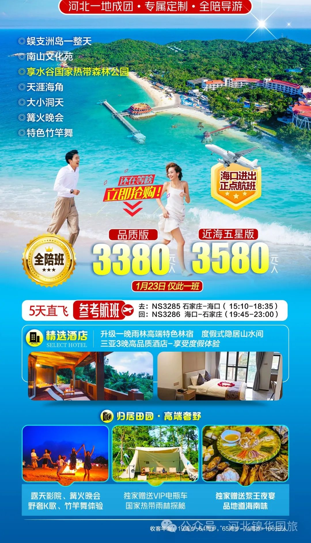![]() ![]() ◆ 产品特色 · 安心游:河北一地成团,休闲度假计划 · 省心游:全陪导游全程陪同,24小时管家式服务 · 舒心游:安排3晚三亚酒店,升级1晚雨林高端林宿,无赶路、不奔波 · 玩大牌:蜈支洲岛一整天、南山文化苑、天涯海角、天堂森林公园、大小洞天、玫瑰谷…… · 狂欢夜:露天影院、林宿K歌、篝火晚会、欢快竹竿舞、黎苗服饰自拍、黎苗歌手献唱…… · 行:专业优秀导游服务;绝不压缩景点(不可抗力因素除外);不压缩游玩时间;不减少景点 · 赠:价值50元/“天堂森林公园”观光车,国家森林公园VIP电瓶车,旅行中矿泉水1瓶/人/天 报名咨询:83759789 锦华国旅