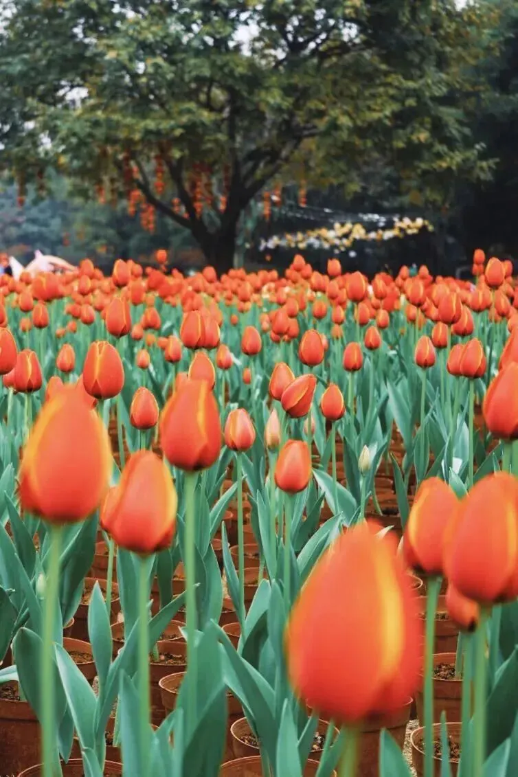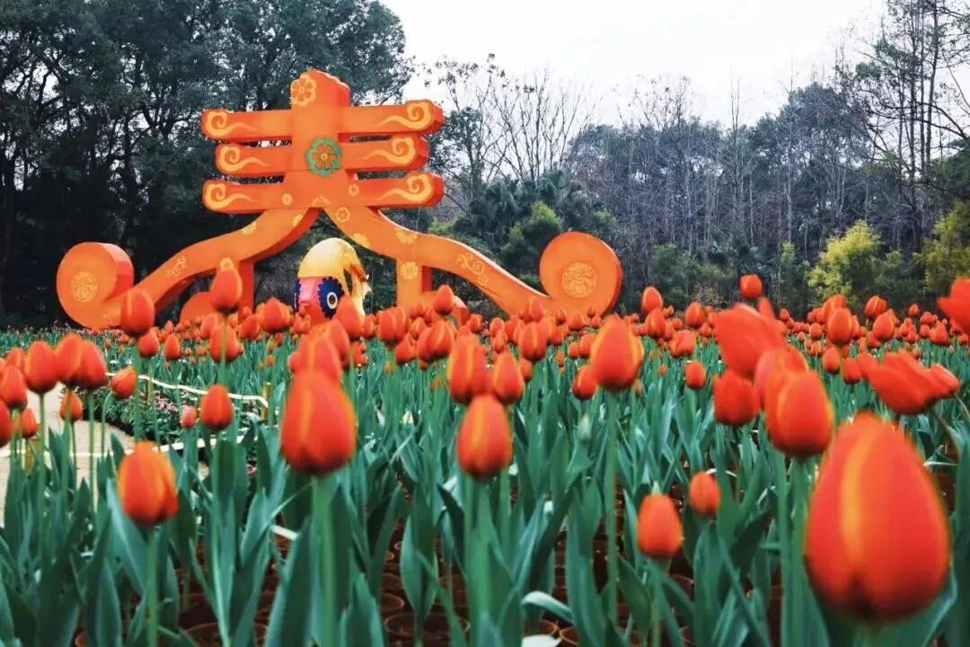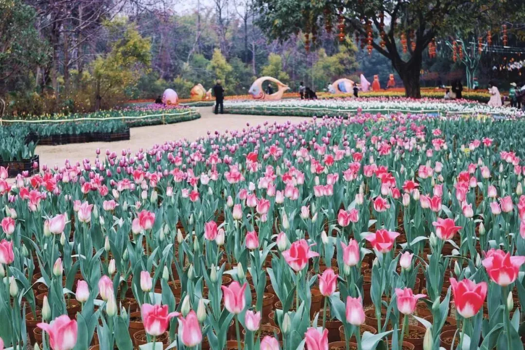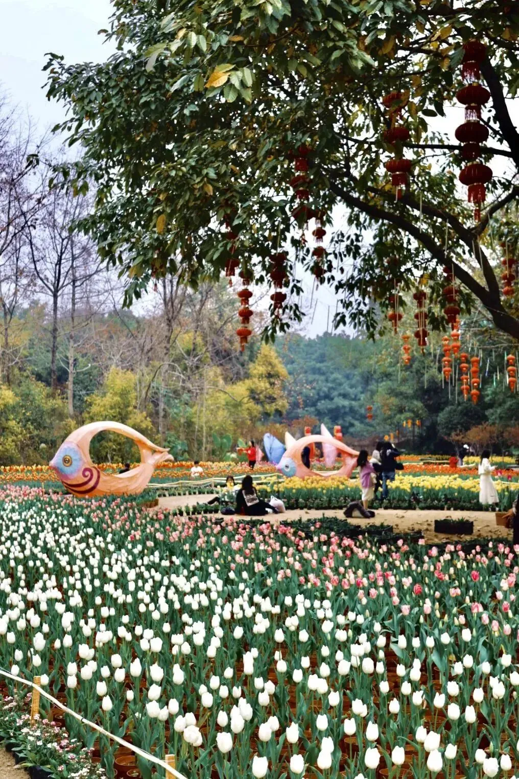 郁金香迎风绽放,黄、粉、紫、红各色交织,搭配园内新春花灯点缀,氛围感直接拉满,山水映着花海,随手拍都是春日大片。