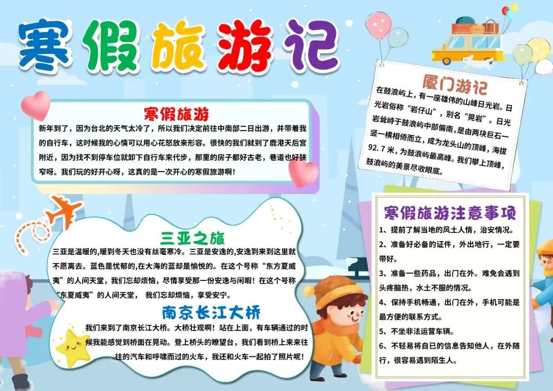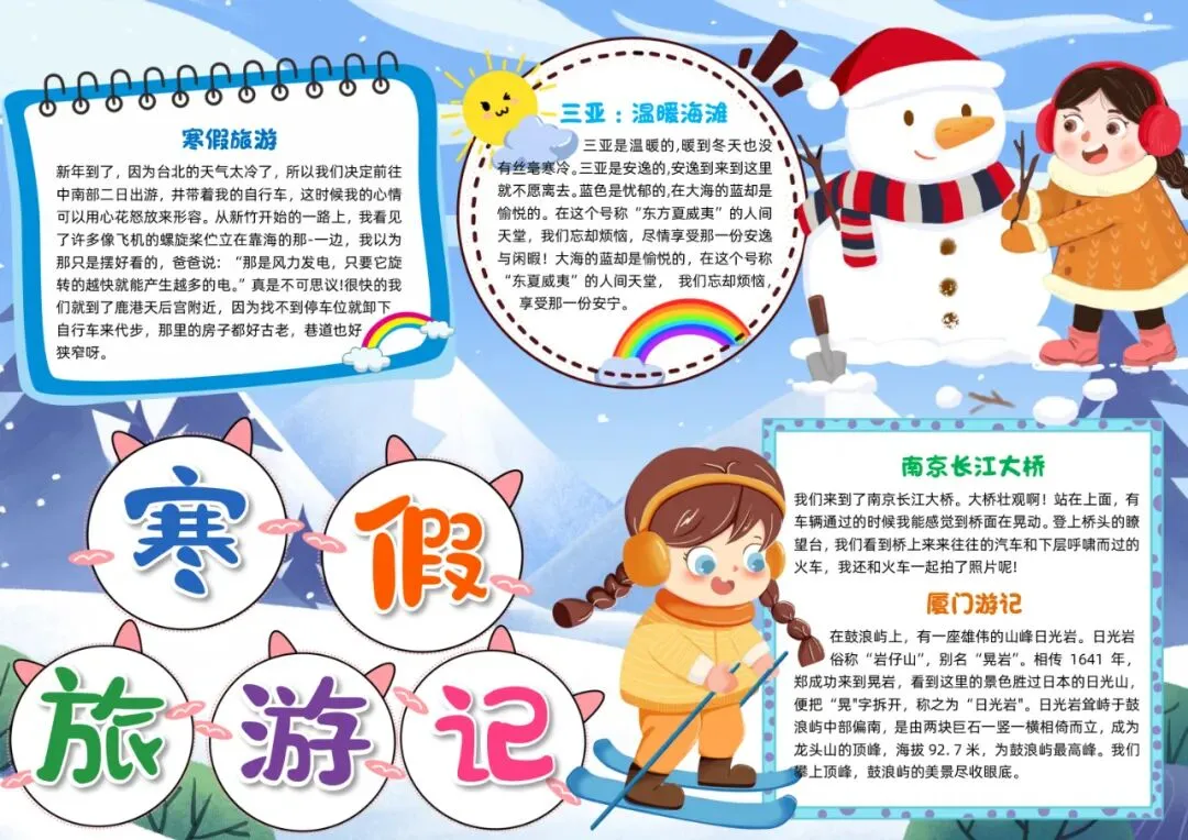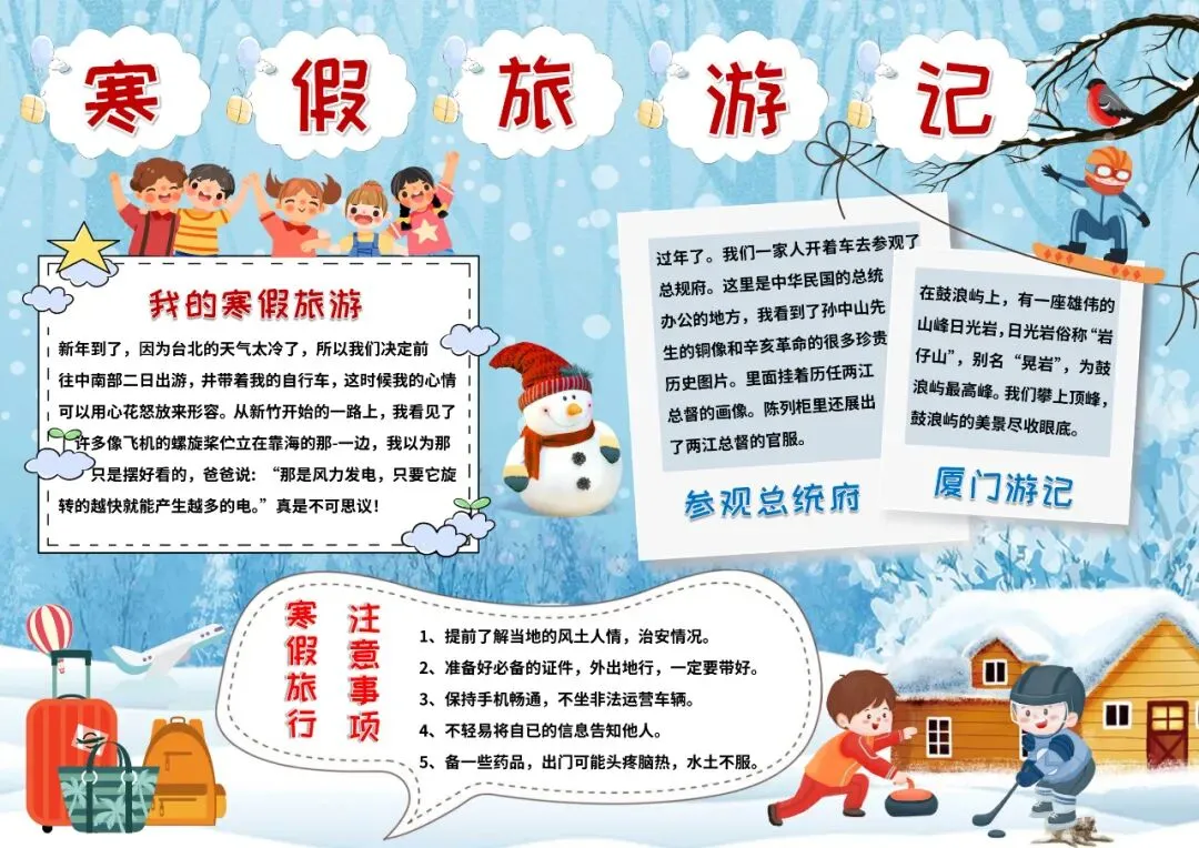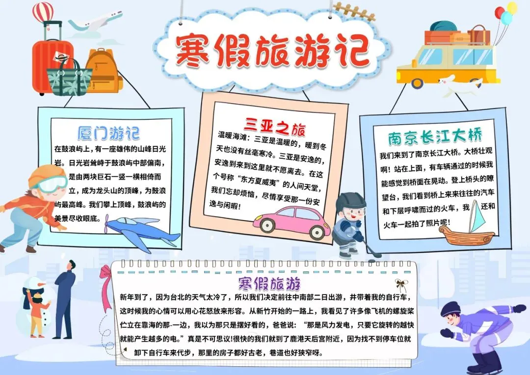 蓝色卡通寒假旅游记寒假旅游小报手抄报寒假小报手抄报