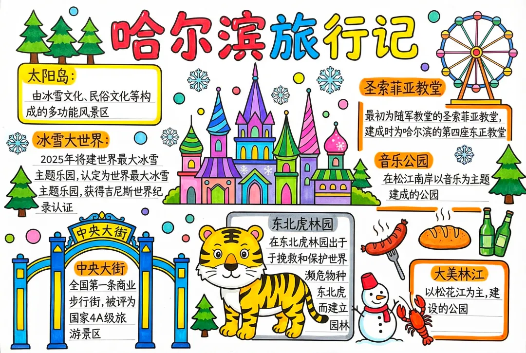 彩色卡通手绘哈尔滨旅行记小报手抄报